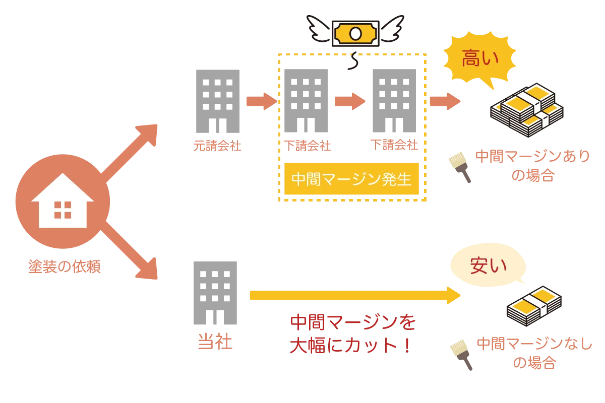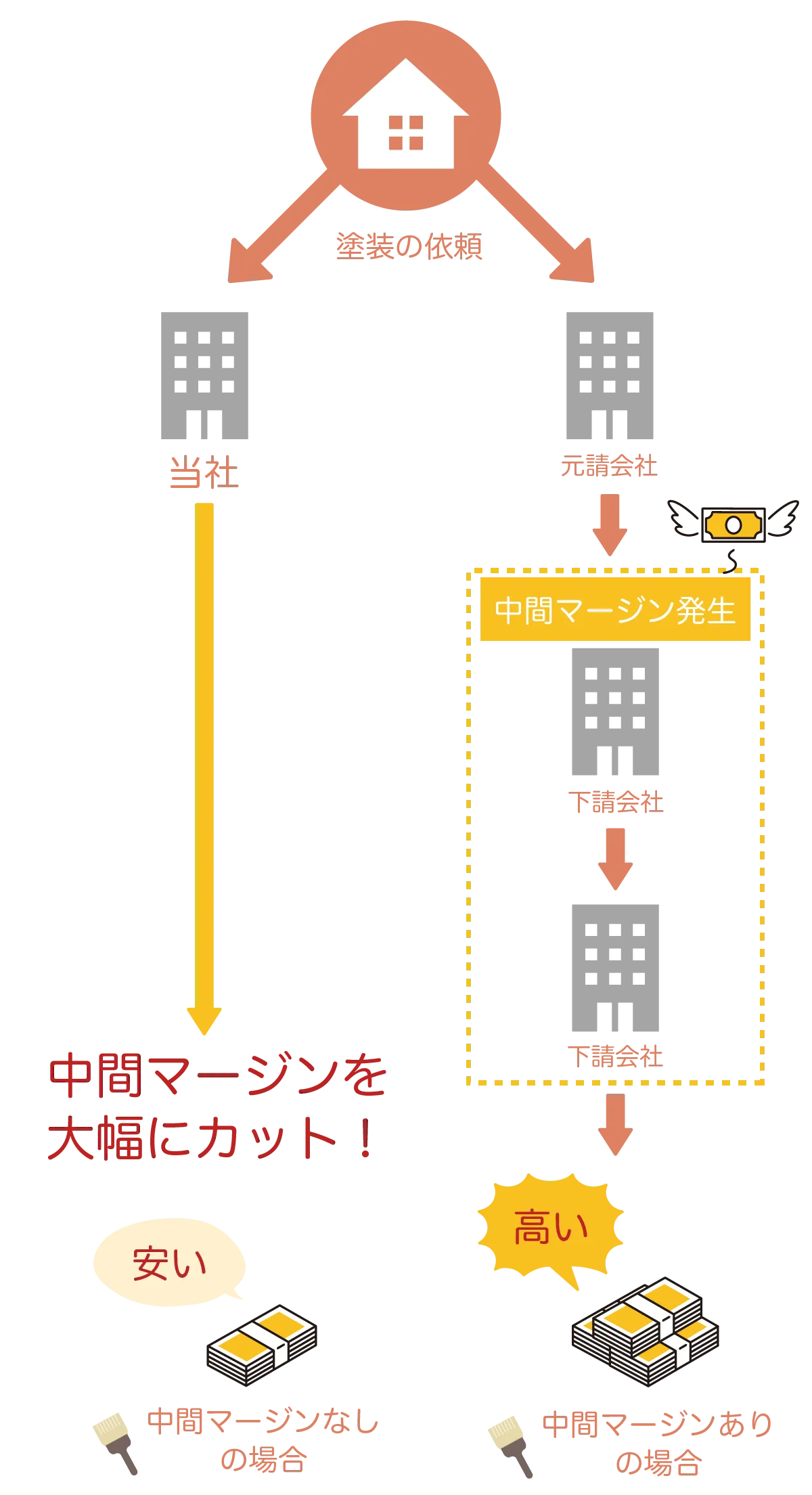 中間マージンが一切ないため、余計なコストがかからず、高品質なサービスや製品を適正価格でご提供できるのが大きなメリットです。