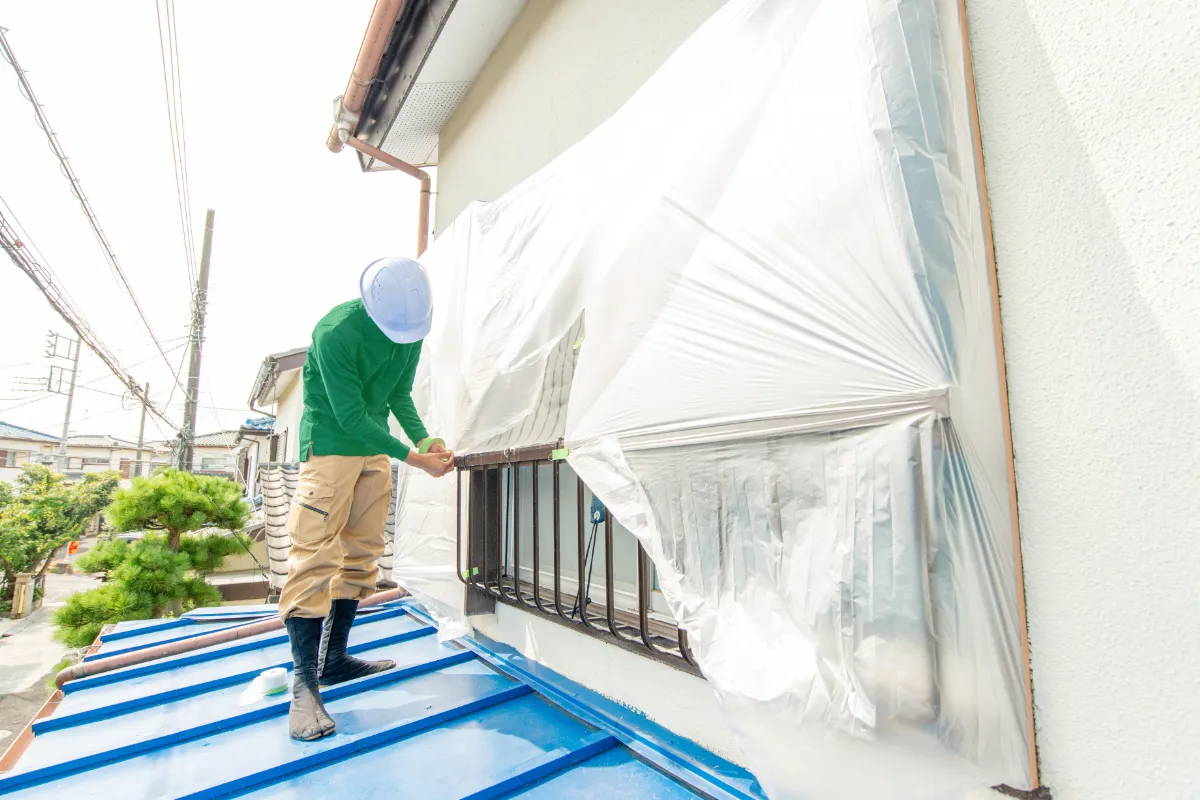 窓や玄関扉、ベランダの手すり、植木など、塗料が付着してはいけない部分はビニールシートやテープでしっかりと保護します。 風で飛んだりめくれたりしないよう丁寧に養生を施すことで、作業後もスッキリとした美しい状態を保ちます。